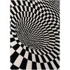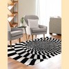 A: The rug features mesmerizing vortex patterns in striking black and white designs.