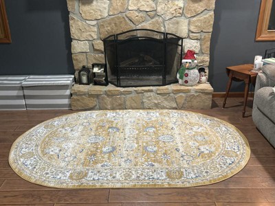 Size in FT: 5' x 8' Oval - Size in CM: 152 x 244 - Pile Height & Thickness: - Colors: Tuscan Yellow, Blue, Ivory, Gray