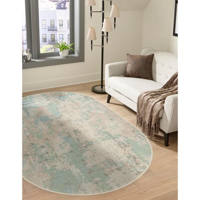• Size in FT: 4' 1" x 6' 1" Oval - Size in CM: 124 x 185 - Pile Height & Thickness: - Colors: Sky blue, Ivory, Light Blue, Gold, Gray, Pink