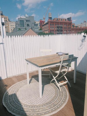 I got this rug to add some dimension to my rooftop area. I layered it over a brown woven rug and it looks phenomenal! I placed it outside and it has held up great in the weather. The colors have faded a little bit from the sun, but it still looks great. It definitely needs a few days under some books to lay flat, but overall I love it!