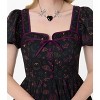 This adorable 1940s style swing dress is crafted in a lightweight woven fabric that features mystical icons printed throughout the black backdrop. The bodice features a faux button up front topped with a cute bow and is framed by short elastic puff sleeves. Complete with a back zipper to cinch the waist.