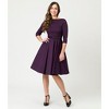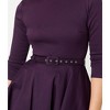 Devon’s got a relentless drive, gals! A fantastically faithful 1950's silhouette from Unique Vintage, the Devon Dress is a sultry swing full of unstoppable beauty. Cast in a eggplant stretch bengaline, the marvelous sturdy stretch fabric provides an enchanting and eye-catching embellishment to your figure with a darted bodice and dramatic bateau neckline that drops into a sultry V in the back. The sleek three-quarter length sleeves allow for cheeky pin-up posing as the dynamic swing skirt drops to your knees with ample room for a petticoat pop. Outfitted with hidden side pockets, a back zipper, and a charming belt to cinch in your form, drive it like you stole it!