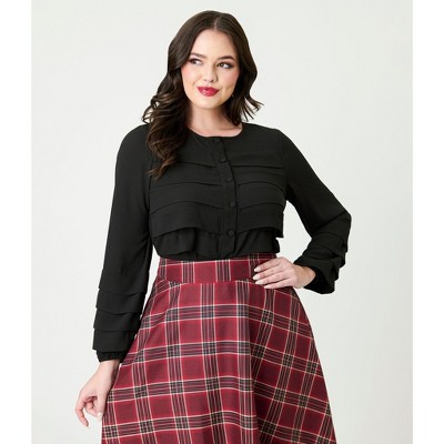 Great style is in your hands, dames! Unique Vintage’s own Colvin Blouse is a vintage style top in graceful chiffon, featuring a classic button up placket with dainty vertical pleating detail on the front. Affectionally detailed with a retro style yoke back and charming short sleeves with keyhole self tie cuffs and gathering for feminine form. Topped with a stately winged collar and crafted in a semi-sheer woven blend, it's a polished performance!