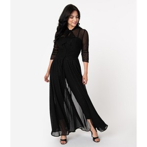 A dramatic and divine addition to your vintage wardrobe crafted in a beautiful mesh that dances with Swiss dots throughout, the breathtaking robe boasts a self tie neck bow and elegant three-quarter length sleeves, embellished with subtle gathers while the banded waist is nipped in with buttons. The pleated maxi skirt sweeps to the floor while the open front allows for marvelous movement. Pair with the matching jumpsuit for a jaw-dropping opening act!