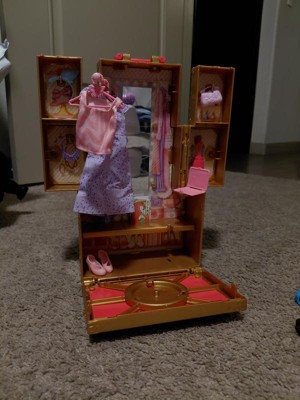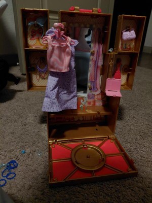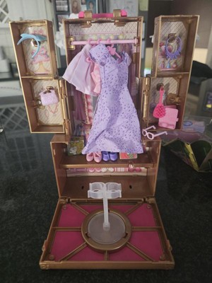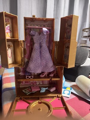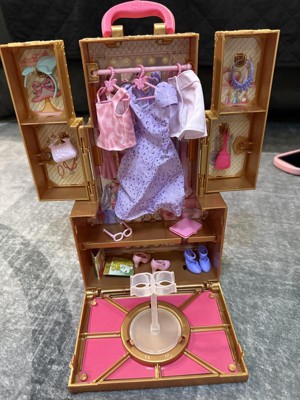 [This review was collected as part of a promotion.] Very nice closet trunk and accessories. Everything included is very detailed and has a place. Outfits are also very cute and coordinated. The closet bar pivots out. There is a spot on the bottom for a Barbie to stand with a clear plastic leg brace. Most of it is plastic, but the front and back are cardboard. This includes the backgrounds on the inside. Great toy with lots of great detail, but the cardboard makes it not as durable.