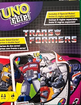 [This review was collected as part of a promotion.] We loved this version of Uno! We had the original, but not the Flip. And we enjoy Transformers also. This game has quickly made it into our card game nights on a regular basis. My kids love playing it, both too see the various Transformers as well as flipping the deck. Getting to play draw 5 on someone is one of their favorite things to do and it sends them into giggles every time. There are SO many Transformers used, that we are still trying to figure out the names for a few of them.