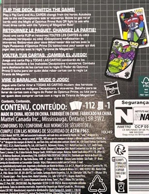 UNO Flip! card game adds an exciting twist to the classic game that includes Autobots and Decepticons from Transformers! Play a Flip card and the deck FLIPS from the Autobots' side to the Decepticons' side, which has penalties that are extra tough. Battle to get rid of cards with the Might of Optimus Prime Rule OR fight to see who must draw cards with the Tyranny of Megatron Rule! Only another Flip card can change things back. Makes a great gift for players 7 years and older, especially Transformers fans. Colors and decorations may vary.
