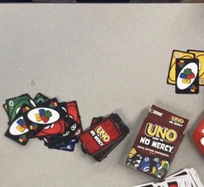 - • UNO Show 'em No Mercy card game adds 56 more cards, special rules and super-tough action cards for the most brutal edition of UNO ever!