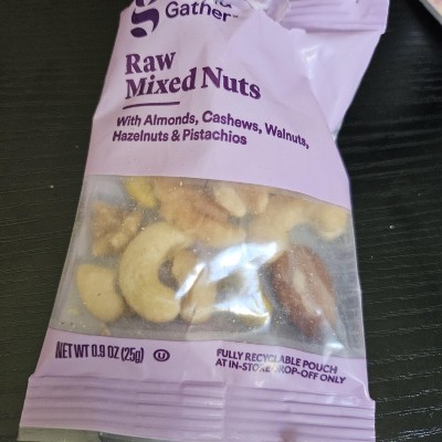 I have never seen a raw mixed nut medley before so I was super excited to buy this for my afternoon snack. It gets me through the rest of my work day to my workout. I love the single serving size bags (because I will absolutely over eat nuts if given a giant bag!!). However, I had to take away a star for ridiculous packaging. The plastic of the bag is so thick and impossible to open. Literally impossible! I have to use scissors which is just annoying and inconvenient! So much so, I felt the need to write this review. But once inside the bag, the nuts are perfect!