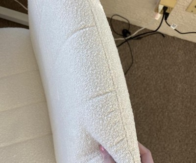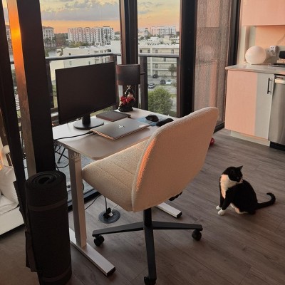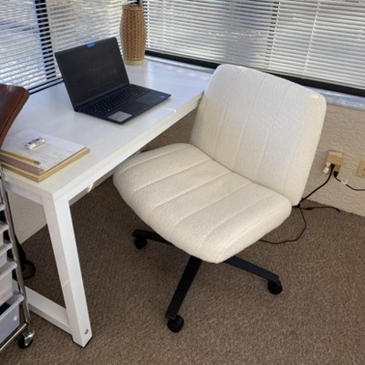 A: Hi, This upholstered, armless office chair is crafted with a wooden frame and features crisscross fabric upholstery with a padded seat and back for comfy seating. The swivel mechanism lets you rotate the chair 360 degrees, while the casters at the base allow for easy maneuverability. Plus, you can adjust the height with a lever to customize the chair to your liking. - Lima