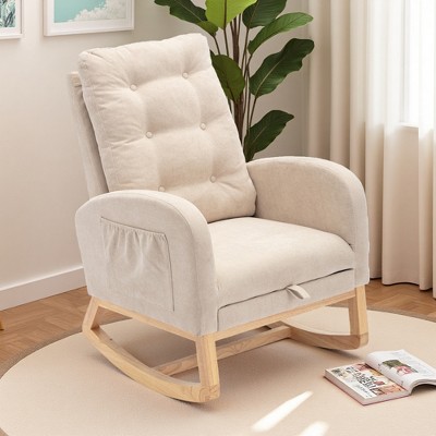 - Upholstered Rocking Chair: Comfortable living room rocker lounge armchair with solid wood base, high-back design, and side storage pocket.