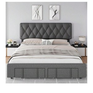 - Upgrade your bedroom with this elegant upholstered bed frame, designed with 2 spacious storage drawers for added functionality. The sturdy solid wooden slats ensure long-lasting durability and optimal mattress support. The beige/grey color adds a touch of sophistication, while the Full and King size options cater to your specific needs.