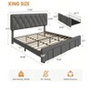 - This upholstered platform bed frame features 2 convenient storage drawers, perfect for keeping your bedroom clutter-free. Built with solid wooden slats, it provides excellent mattress support without the need for a box spring. Available in a stylish beige/grey finish, it complements any modern decor. Choose from Full or King size to suit your space.