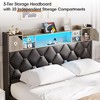 Elevate your bedroom with this multifunctional bed frame, featuring a comfortable 45-inch high headboard with three tiers of smart storage—including 8 open shelves for daily essentials and 2 hidden compartments for private items—all cushioned with premium linen and high-density foam. Three spacious under-bed drawers (2 on the sides, 1 at the foot) glide smoothly for effortless organization. Set the vibe with dazzling RGB LED lights on the headboard, offering 60,000+ colors controllable via app or remote, plus music sync. Stay powered up with the integrated charging station equipped with 2 AC outlets and 2 USB ports.