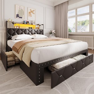 Upholstered Platform Bed Frame with LED Lights, Storage Drawers & Charging Station