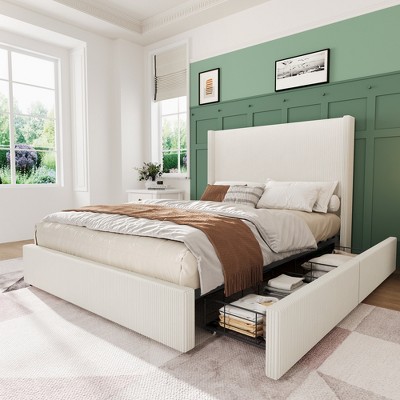 Elevate your bedroom with this stylish upholstered platform bed frame, featuring a soft corduroy wingback design with elegant tufted detailing on both the headboard and footboard. Designed for comfort and functionality, it includes spacious under-bed storage drawers to keep your space organized. The sturdy platform structure eliminates the need for a box spring, while the easy assembly process makes setup simple and stress-free. A perfect blend of luxury and practicality for any modern bedroom.