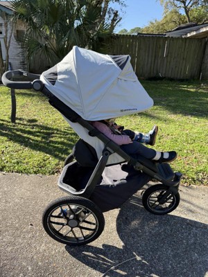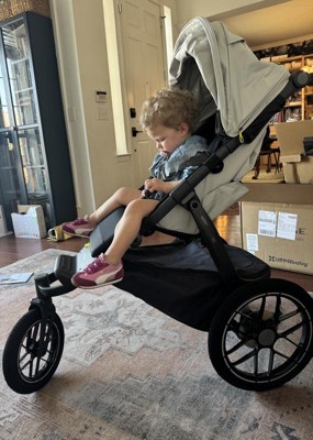 [This review was collected as part of a promotion.] Let me preface this by saying, I've always wanted a jogging stroller to take my babies and especially toddlers on walks/jogs around the neighborhood. I have researched and tried every popular brand of jogging stroller and had never pulled the plug for various reasons. So when Stellar Product Testing Panel reached out to me about trying the new UppaBaby Ridge v2, I was thrilled because it was one I hadn't tried before and I would finally get that opportunity to jog with my babies. When it arrived, we immediately took it out of the box and my first instinct was that it is a beautiful stroller. It is so aesthetically pleasing, sleek and modern. It is literally the nicest looking jogging stroller I have ever seen. Its weighty, feels and looks expensive. It was super easy to put together- just popping the wheels on. We have another UppaBaby stroller and so I was familiar with how you take the wheels on and off. You just push the button in the center of the wheel and they very easily come on and off. Opening and closing the stroller had a little bit of a learning curve to me but once I figured out that you slide the button and press it (thank you uppababy for a child proof method!), it was a total cinch opening and closing the stroller. We have taken it on walks every single day that we have had it now. It drives like a total dream- on any surface! The suspension and shocks system is incredible and makes it so smooth for the child inside- so much so that my "never nap outside the bedroom" two year old, FELL ASLEEP one day! Amazed is an understatement. The wheel size and the type of tires probably helped a lot with that too- they are not only functional but they look super cool too. The handlebar is really nice because it easily moves up and down if a sibling, myself or my husband wants to push the stroller. The covered basket is so cool and kept everything safe and secure. The harness system is great because I felt like my daughter was secured tightly in the stroller. The cup holder is okay but kind of at a weird angle and doesn't hold any of my bigger water bottles (not a reason to not get the stroller IMO because this is literally the only thing I don't love about it). And the sun shade, THE SUN SHADE, is the holy grail of sunshades. It opens easily and the normal setting is so great for blocking the sun. BUT THEN, it can unzip on the edge and opens one more setting and it goes down at a height I have never seen before. It completely blocks the sun from your child at any angle. This was especially nice when my daughter fell asleep because it could be somewhat dark for her. It's easy to zip back up so she can see when she is awake. As someone who has researched and tried basically every jogging stroller, get this one. WOW. It is the best of the best for jogging strollers and I will now recommend it to every friend of mine looking for one. You can't get a better stroller and it's worth every penny. Thank you Stellar Product Testing Panel for letting me try the new Uppababy Ridge v2- it has really enhanced our life in more ways than one!!