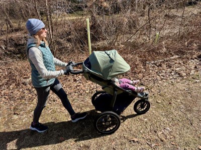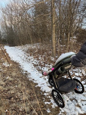 [This review was collected as part of a promotion.] Thanks to the Stellar Product Testing Panel, I was able to test out the very comfortable and smooth-riding Ridge V2. As a mom of a toddler and one more on the way who lives in Colorado on the trails, I loved having this jogging stroller as one of my stroller options. The first thing I noticed was the smooth suspension and the large wheels. Even my husband who worked in the automotive industry complimented the suspension of the wheels. It turned out being just as smooth on a gravel path behind our house as a paved path. My child did not react one bit when we transitioned from the paved trail to the gravel trail - he was totally comfortable! We also loved the single handed hand brake on the push handle, which was easy to press and keep the stroller in control especially on downhills. Everytime we used the non jogging stroller, we immediately noticed the lack of a hand brake because the Ridge V2 got us so used to slowing down with just a quick press! If your child is used to a stroller with a snack tray or front bumper bar, this stroller doesn’t have that. However, it does have small pockets on either side of the seat interior to store anything from snacks to pacifiers or, like with my kiddo, to be used as a fidget toy during jogs / walks. Our garage is pretty spacious so we didn’t need to fold it up and left it open most of the time, so I can’t say how easy it was to fold down. I will say the stroller itself does feel substantial - it’s solid, somewhat weighty, and large. It’s not at all flimsy but on the flip side does take up more space whether storage or on the trails. A few things I especially loved about the stroller: - The extended canopy. There is a zipper extension for full coverage during sunny or windy days. Kiddo appreciated that, especially because he won’t keep a hat or sunglasses on without a fight! - The easy foot brakes (parking brake). Most strollers have a single flip up-flip down foot brake in the bottom middle of teh stroller. The Ridge V2 actually makes parking the stroller super easy by having one small foot brake on next to each back wheel that the pusher only needs to step down on. They are easily labeled even for moms with pregnant mom brain - green for go and red for stop. Parking and getting going are FAST - a big pro especially for those kiddos who start whining when you stop. - The underseat storage was big - the water bottle holder was big enough to hold my large 32 oz bottle and solidly secured. No other stroller I’ve used has been able to accommodate my size of water bottle - or the bottle holder was too flimsy or shaky and the bottle would constantly fall out. Not fun chasing a water bottle down the trail when I have a toddler and a pregnant belly. Safe to say my water bottle has NEVER fallen out of this large and secure bottle holder so I could run, jog, or walk as fast as I wanted. - The covered underseat storage. Most strollers I’ve used have an underseat storage basket, but the Ridge V2 is cool because it has a large basket with a cover. The cover features a zipper and a bungee clasp to keep the basket closed during twists and turns. We have thrown many snacks, extra layers of clothing, and even toys down there without them falling out even on gravel paths going up and downhills. A few things to note: - If your kiddo is used to a reclining seat or a seat with an adjustable foot rest, this one does not appear to have that option. The seat itself is not as deep as a regular stroller so depending on how your kiddo feels, they may or may not last as long as in a regular stroller. - We are lucky enough to live walking distance to jogging and running trails paved and non-paved but if you need to drive to trails, this stroller would probably take up decent space in your trunk. - The handlebar has a foam covering, which - although it is cushy for your hands - may not last as long under the sun or rain. Probably best not to store it outdoors if possible. Overall, I’m impressed by the craftsmanship of the stroller and can tell it was built was quality in mind. If you’re looking for a jogging specific stroller and don’t mind the weightiness for the quality build, this one is it - don’t look further.