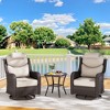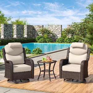 Relax in Style with Our Premium Patio Swivel Rocking Chairs! Enjoy gentle rocking and 360° smooth rotation for ultimate relaxation. Crafted with handwoven all-weather PE wicker and a rust-proof steel frame (supports up to 300 lbs), these chairs are built to last. The 4-inch thick, high-resilience foam cushions feature waterproof Olefin fabric with easy-to-remove zippers for cleaning. The ergonomic high backrest and curved armrests provide full-body support, while the removable headrest doubles as a lumbar pillow.Complete with a 5mm tempered glass tabletop (scratch-resistant & elegant), this set combines durability, comfort, and luxury for your outdoor oasis. Upgrade your patio today!