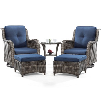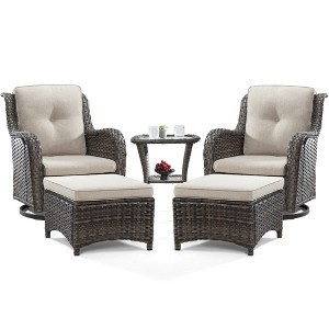 The 5-piece patio chair set, which includes ottomans, can be used to convert an outdoor space into a cozy retreat. The set contains two single chairs, two ottomans, and a coffee table, all of which are designed for style and durability. The pieces are built with a sturdy steel frame and wrapped in premium PE wicker, making them weather-resistant and UV-protected for long-lasting use. The chairs are designed with ergonomics in mind, featuring plush cushions that are sponge-padded for optimal comfort. The ottomans, which are spacious, provide an ideal location for relaxation.The set's simple and natural aesthetic makes it versatile, suitable for various outdoor spaces, including patios, poolside areas, gardens, porches, and backyards.