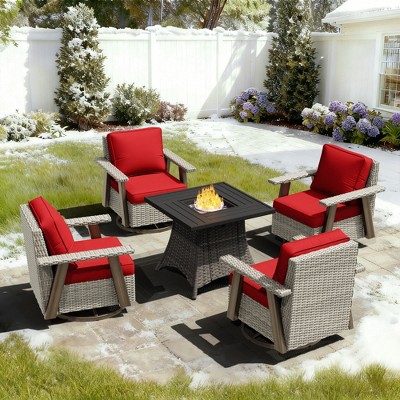 Elevate your outdoor living with the UPTIOT patio set, featuring two swivel rocking chairs (34"W x 25"D), two armchairs (34"W x 25"D), a spacious loveseat sofa (51"W x 25"D), a versatile fire pit (31.7"W x 25.6"D), and a compact side table (20"W x 20"D). Crafted from hand-woven PE wicker that resists unraveling, cracking, and deformation, this set includes 360¡ã swivel bases for smooth rotation and rocking motion, plus a high-load capacity of 250 lbs per unit¡ªensuring all-weather durability, comfort, and effortless entertainment in any backyard setting.
