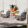 This 3 piece rattan outdoor furniture set has a powder coated steel frame and is covered with high quality hand-woven PE wicker for durability and rust resistance. This 3 piece patio set includes two swivel rocking chairs and a side table. The two chairs swivel smoothly 360° and rock back and forth to enjoy your leisure time to the full. The side table is made up of a tempered glass top and four curved table legs, which greatly increases its weight capacity and makes it very easy to assemble and clean. The modern and stylish design makes this set a perfect addition to your garden, patio, balcony or any other outdoor or indoor space.