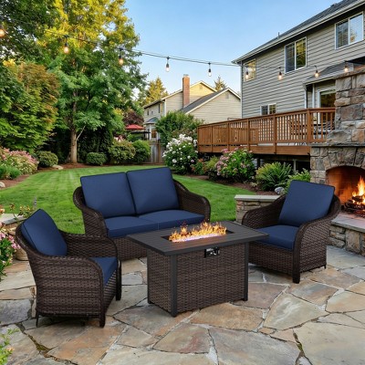 Heavy-Duty Construction: Sofa (750LBS) and loveseat (600LBS) with reinforced frames, complemented by fire pit safety features (adjustable footpads, 15-second ignition).