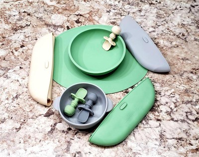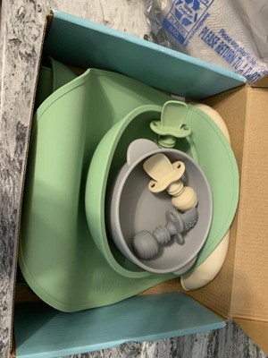 [This review was collected as part of a promotion.] Perfect set! Everything you need for a meal. Love how the bowl suctions to the table so it’s not going everywhere. The spoons are perfect for little hands learning to eat on their own. The bibs are super easy to clean especially if you’re on the go. The silicone makes it easy to wipe down and put the clean bib back in the bag to use later without having tons of used bibs to wash. This also makes a perfect gift set.