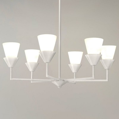 - VISUAL : Defined by geometric shapes, these fixtures feature open frames, except for the topless conical shades on the pendants, made from metal or glass. The chandeliers have airy, cage-like or lantern-inspired frames, suspended from a sleek stem that drops from the canopy. The stem branches out into curved arms near the frame base, each terminating in candelabra base bulbs.