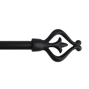 The adjustable curtain rod measures 1" diameter and comes with decorative poly-resin finials in black. The finials measure 4 1/4" long and 2 3/4" wide.