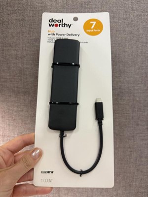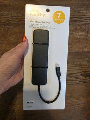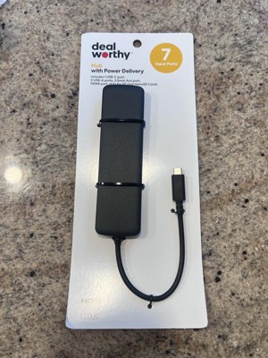 Dealworthy USB-C 7-in-1 Hub with 1-4K HDMI 2-USB-A Gen 3 1-USB-C Aux SDTF Reader and Power Delivery in black. It has 7 input ports and is compatible with USB-C ports. Has approx 6 inch length cord. The hub is for power delivery and supports seamless data transfers.