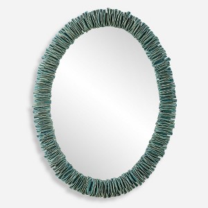 Elevate your wall décor with the Bonaire Teal Blue Oval Mirror — a striking blend of artisan craftsmanship and coastal-inspired charm. This handcrafted mirror features layered ceramic disks, meticulously folded and arranged to form a dimensional oval frame. Each disk is finished in a mottled teal blue glaze, evoking oceanic textures and aged elegance. Because of the nature of fired glazes, each piece has subtle variations, making every mirror uniquely its own. Ideal for living rooms, entryways, or bedrooms seeking a curated artistic focal point, the Bonaire mirror delivers both function and artistic flair.