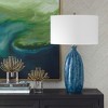 The Bixby Blue Table Lamp blends coastal charm with refined elegance, making it a striking accent for any space. Its heavily textured ceramic base features a rich blue glaze, complemented by plated antique brass details for a touch of sophistication. A crisp white linen drum shade softens the lighting, creating a warm and inviting ambiance. Due to the unique nature of fired glazes, each lamp displays slight variations, ensuring every piece is one-of-a-kind. Perfect for bedrooms, living rooms, or coastal-themed décor, this lamp adds both style and function.