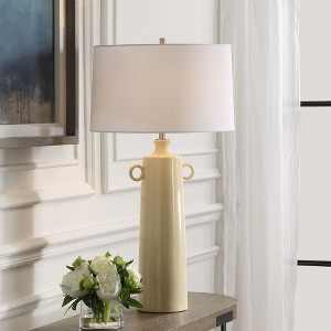 Infuse your space with cheerful elegance using the Florero Pale Yellow Table Lamp. This ceramic lamp features a graceful, vase-inspired base finished in a soft pale yellow crackled glaze that lends warmth and subtle texture to any room. Brushed nickel accents provide a modern metallic contrast, enhancing the lamp's delicate palette.