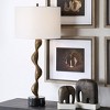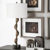 The Remolino Bronze Table Lamp showcases a striking combination of artistic design and timeless sophistication. Crafted from durable cast iron and finished in a plated warm bronze, its playful silhouette is elevated by a thick black marble foot that adds stability and luxurious contrast. Topped with a crisp white linen round hardback drum shade, this lamp creates a warm, inviting ambiance in any setting. Ideal for living rooms, bedrooms, or offices, it perfectly balances style with functionality.