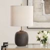 The Blacktop Textured Buffet Lamp offers a sophisticated blend of modern texture and timeless finishes. Its ceramic base features a heavily textured surface in a warm black tone, paired with elegant plated antique brass accents for a subtle contrast. The design is completed with a round hardback drum shade crafted from casual light gray linen fabric, providing a soft and inviting glow. Perfect for accenting sideboards, consoles, or bedside tables, this lamp combines style and practicality seamlessly.