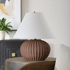 The Keoghan Table Lamp introduces grounded elegance with its rich, earthy terracotta tones and sculptural form. Crafted from porcelain, the base features deep organic channels that add tactile dimension and visual depth. A dark terracotta glaze enhances the natural form, creating a look that's both rustic and refined.