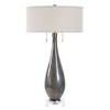 Elevate your lighting with the Cardoni Smoke Table Lamp — a refined fusion of muted elegance and bold metallic detail. Featuring a smoke gray glass body infused with subtle iridescent bronze hues, this lamp exudes quiet sophistication. Accents of plated brushed brass and a thick crystal base add polish and weight, anchoring the lamp with modern glamour. Topped with a white linen hardback drum shade with natural slubbing, it provides a soft, diffused glow that enhances any setting.