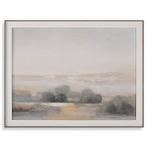 Immerse your space in the serene charm of the English countryside with the Atmospheric Neutral Landscape Print by Julia Purinton. This artwork beautifully captures rolling hills and open skies in a soft, dreamlike palette of neutral tones, offering a sense of calm and timeless beauty. The piece is elegantly framed in a thin light gray molding with subtle wood grain detailing and complemented by a white linen liner that enhances its refined character.