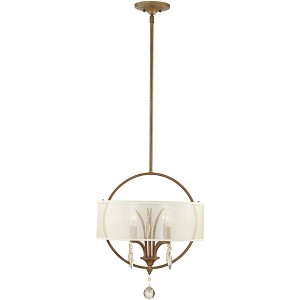 With golden teak crystal leaves accenting the metal frame of this burnished gold pendant, the look is lavish and elegant. It comes with four traditional candelabra style lights shrouded within a silken champagne sheer fabric shade. From the Alenya collection by Uttermost.