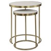 The Aragon White Nesting Tables Set of 2 blends elegant textures and functional design to elevate any modern living space. Each table features a sleek, brass plated metal base supporting a faux white shagreen wrapped top that offers a sophisticated and tactile finish.