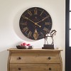 Add timeless sophistication to your walls with the Bond Street 30” Wall Clock, SKU: 06030. Designed with a vintage-inspired aesthetic, this oversized round clock features a laminated black face with a weathered, crackled texture, giving it an authentic aged look. Cast brass details and an internal pendulum add charm and character, while the quartz movement provides reliable and accurate timekeeping.