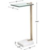 The Uttermost Butler Brass Accent Table blends modern design with timeless materials, making it the ideal pull-up companion for sofas, chairs, or reading nooks. Crafted with a brushed brass-plated stainless steel base, the table features a tempered glass top and is grounded with an elegant white marble foot that showcases unique natural veining. Compact and luxurious, this accent piece measures 23.5"H × 11"W × 8"D, making it perfect for tight spaces that need a functional yet stylish surface. Ships fully assembled for effortless styling.