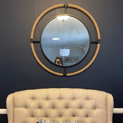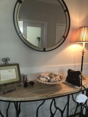 This beautiful metal framed mirror set the tone as I was looking for a mirror that would compliment my metal foyer table. I love the inner touch of gold . Beautiful and priced right.