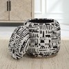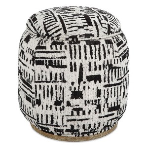 The Dialogue Poof Ottoman with Removable Top and Black Off White Abstract Pattern effortlessly blends artistic flair with everyday functionality. Its bold black and off-white abstract upholstery acts as both a design statement and a neutral complement to various interior styles. Resting on a solid wood base with an oak finish and beige ceruse detailing, this ottoman is as durable as it is eye-catching.