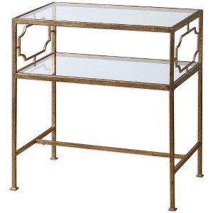 Bring refined elegance to your space with the Uttermost Genell Side Table, a striking blend of timeless glamour and modern function. Featuring a decorative forged iron frame finished in a luxurious antique gold leaf, this 25.75" high side table is topped with clear tempered glass for an airy, open feel. Measuring 23.875" wide × 14" deep, its compact profile and dual-shelf design make it ideal for smaller living areas, bedrooms, or entryways. The glass gallery shelf adds visual lightness while offering extra storage or styling space. The Genell effortlessly elevates any transitional or glam interior.