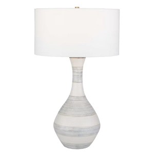 Infuse coastal charm into your décor with the Potter Striped Ivory Blue Table Lamp. Handcrafted from ceramic and designed by Grace Feyock for Uttermost, this lamp features a gently fluted base adorned with elegant stripes in soft ivory, blue, and tan glazes. Antique brass plated accents add a classic touch, while the crisp white linen drum shade provides a clean, refined finish. Each lamp is uniquely glazed, making every piece subtly one-of-a-kind.