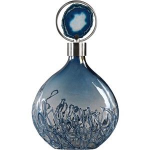 Artisans at Uppermost pulled out all the stops on this chic piece. Made from sky blue iridescent glass with accents in iron and agate stone, it's exquisite enough to serve as a centerpiece for a decor ensemble. Note the brushed nickel plated removable lid on this contemporary sky blue glass bottle.