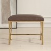 The Reform Gold Small Bench combines timeless transitional style with a touch of modern sophistication. Upholstered in cocoa distressed faux leather, it exudes rich character and durability. The sturdy iron base, finished in a lightly antiqued gold, provides both strength and a luxurious accent. This versatile piece can serve as a compact seating solution, an entryway accent, or a stylish footrest, enhancing any interior with its warm tones and elegant profile.