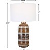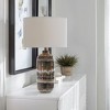 Showcasing a blend of artisan character and timeless elegance, the Uttermost Roan Artesian Table Lamp brings warmth and texture to any space. Crafted from ceramic and metal, the base features a ribbed surface glazed in a medley of natural tones including clay brown, taupe, white, and charcoal. Antique brass accents elevate the organic look with a subtle metallic touch. Measuring 15.5"D × 15.5"W × 26.5"H and weighing 6.6 lbs, this lamp is topped with a round white linen hardback drum shade. Designed by David Frisch, it uses one 100W Type A bulb and features a simple on-off socket. Please note: glaze patterns and tones may vary slightly, enhancing the handcrafted authenticity of each piece.